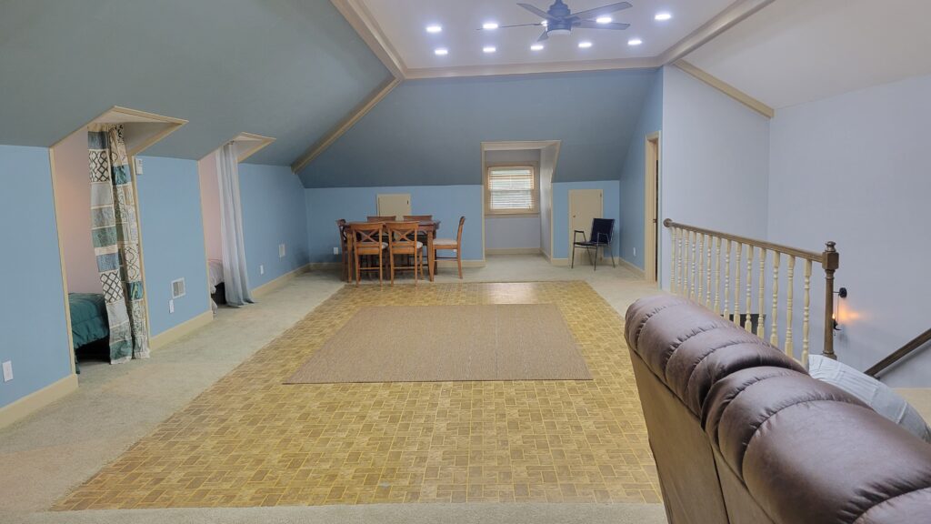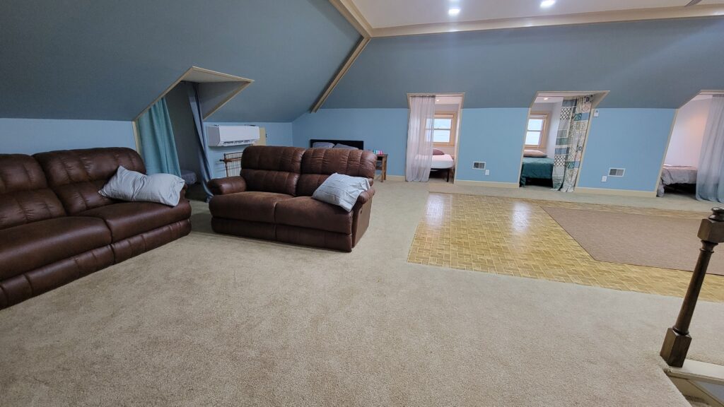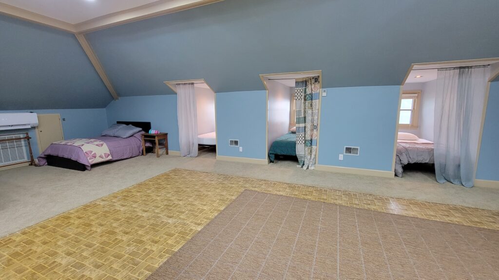 Third Level Studio “Apartment” – 1 full-size bed, 4 twin beds in dormers, dining area, den, & full bath